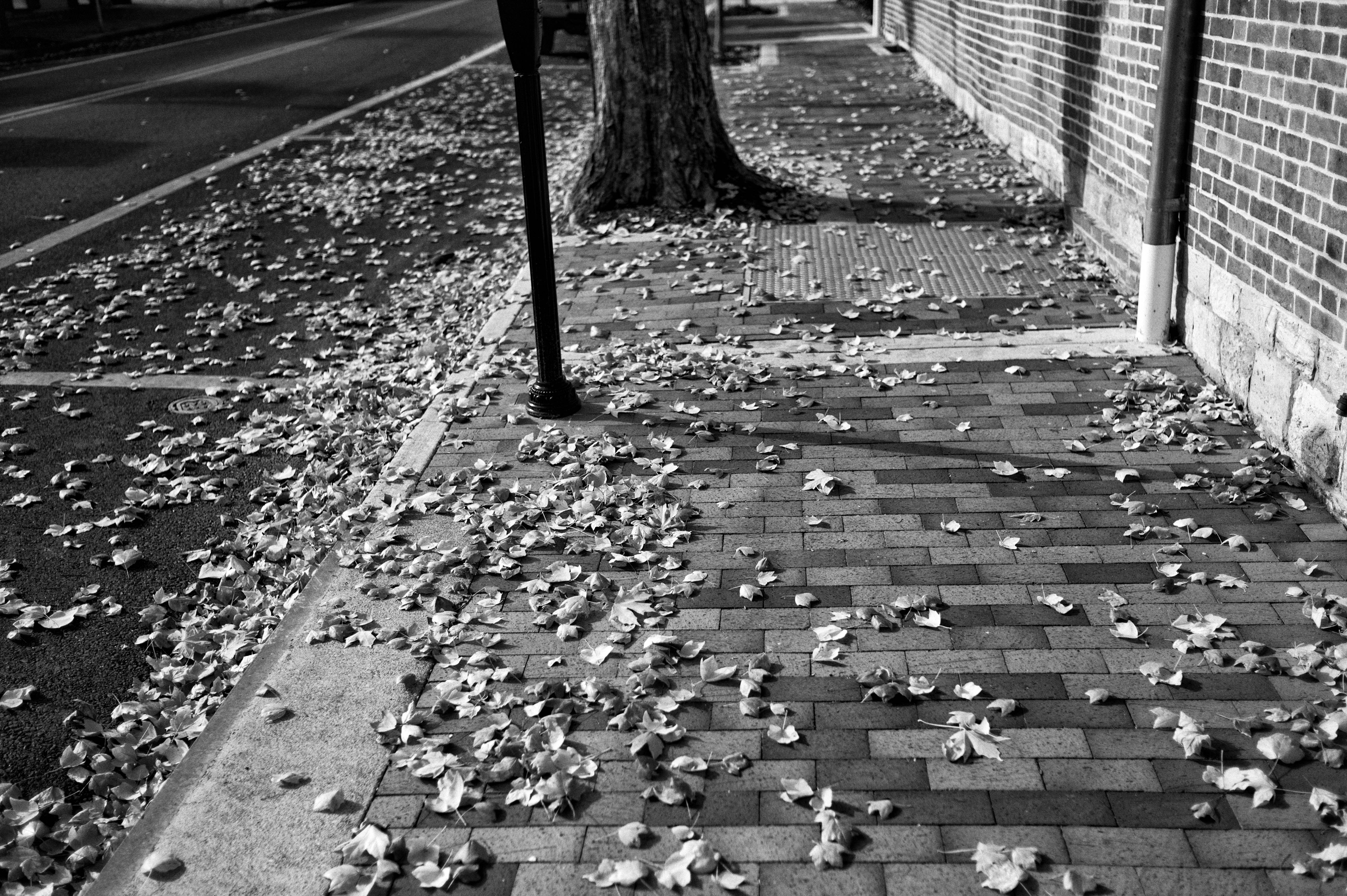 A serene sidewalk scattered with fallen leaves creates a sense of quietude and nostalgia. The monochromatic tones enhance the texture of the bricks and leaves, evoking a contemplative mood. A nearby tree and a lamppost stand as gentle guardians to this peaceful moment in the fading light of day.