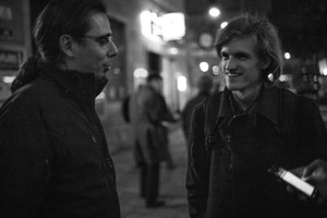 In a dimly lit street, two men engage in lighthearted conversation, their expressions reflecting camaraderie and comfort. The surrounding scene is blurred with soft city lights, creating a moody atmosphere that captures the essence of nightlife. The contrast of shadows and warm lights enhances the intimate tone of their exchange.