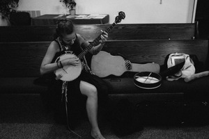 A lone musician sits on a wooden church pew, deeply engrossed in strumming her banjo. The soft, muted lighting casts an intimate and reflective mood, highlighting her focused expression and the delicate details of her attire. Surrounding her are instruments in quiet repose, suggesting a moment of creative solitude amidst the backdrop of a larger gathering.