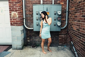The photograph captures a woman in a light blue dress standing gracefully against a backdrop of textured red brick and utility meters. The mood is both introspective and casual, enhanced by soft, natural lighting that accentuates her relaxed pose and bare feet. This juxtaposition of a poised subject and a gritty urban setting creates a striking sense of contrast and depth.