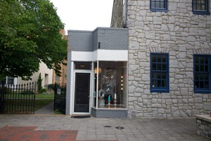 The photograph captures a quaint corner storefront characterized by its striking gray brick facade and large glass window display. The muted, overcast lighting casts a calm ambiance over the scene, where soft green foliage contrasts beautifully with the structured stone wall of the building. Situated amidst a cobbled pathway, this charming urban setting evokes a sense of nostalgia and quiet exploration.
