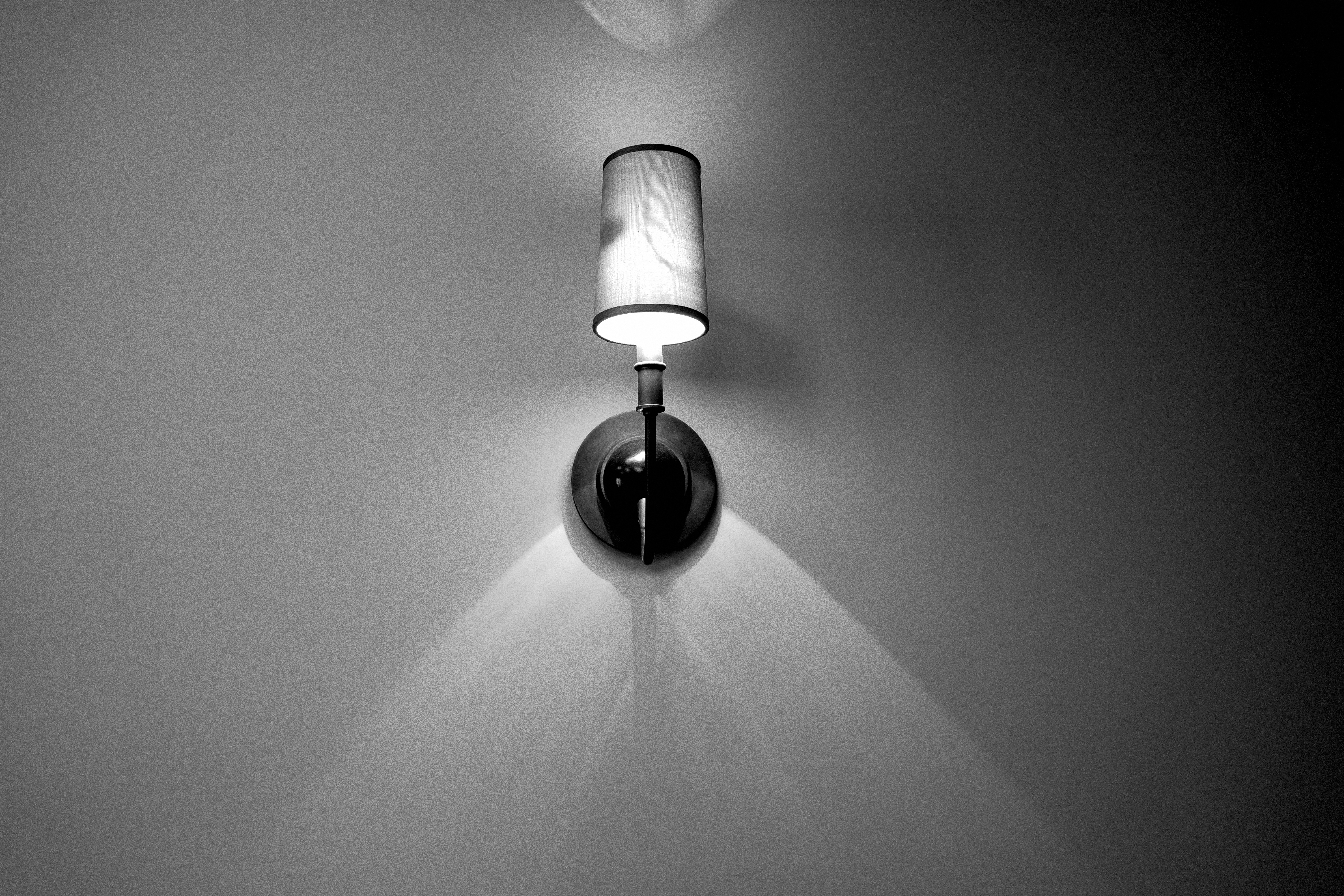 A sleek wall-mounted lamp casts a soft, diffused glow against a muted background, creating a sense of serene simplicity. The monochromatic tones emphasize the lamp's elegant form and the gentle play of shadows, evoking a calm, introspective mood. The composition centers on the lamp, highlighting its role as both a source of light and a sculptural element in the space.