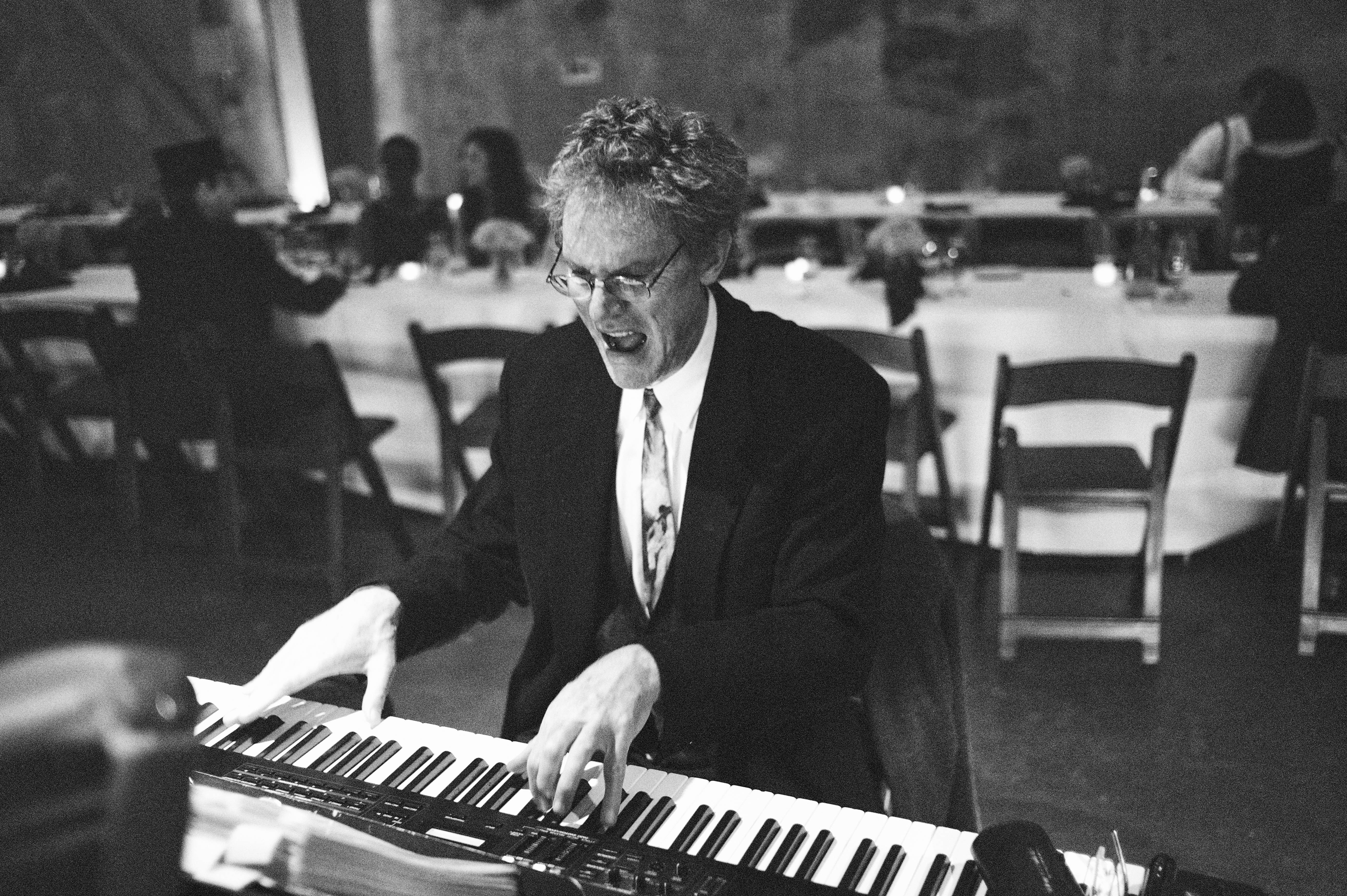 In this captivating scene, a pianist passionately engages with the keys as soft candlelight glimmers in the background, casting a warm glow over the elegant setting. The expression on his face reveals a deep emotional connection to the music, contrasting with the muted tones around him. The atmosphere is intimate and lively, evoking a sense of celebration and artistry within the gathering.