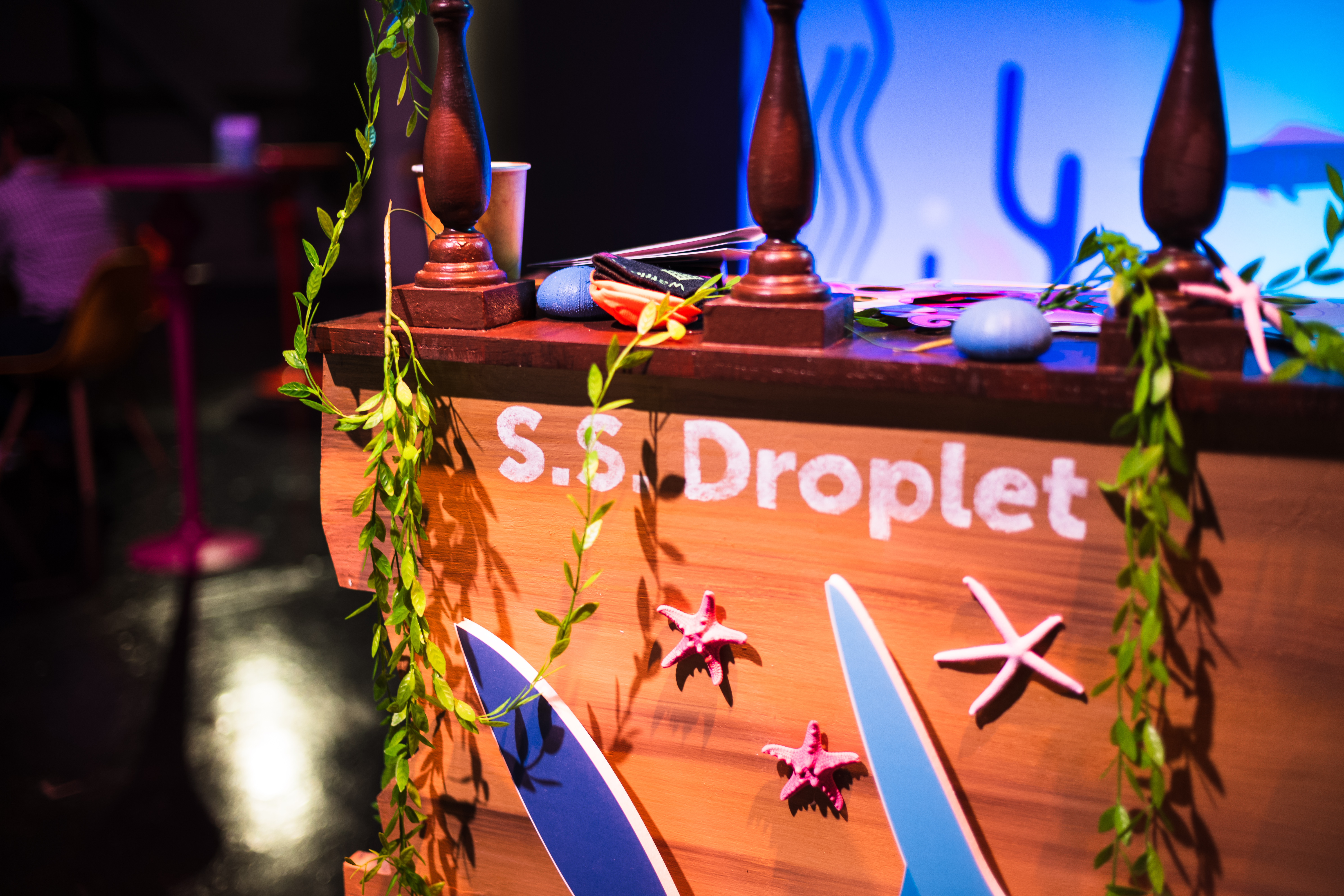 The photograph captures a colorful stage setup featuring a whimsical wooden counter labeled 'S.S. Droplet'. Adorned with vibrant decorations like starfish and surfboards, the scene radiates a playful and inviting mood, complemented by soft, ambient lighting that enhances the cheerful colors. Lush green vines cascade down, adding an organic touch to the lively maritime theme.