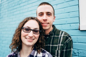This photograph captures a couple standing closely together, radiating warmth and love. The soft lighting accentuates their smiles, while the vibrant blue wall adds a cheerful backdrop that enhances the joyful mood. Both individuals wear coordinating flannel shirts, creating a sense of unity as they share a tender moment.