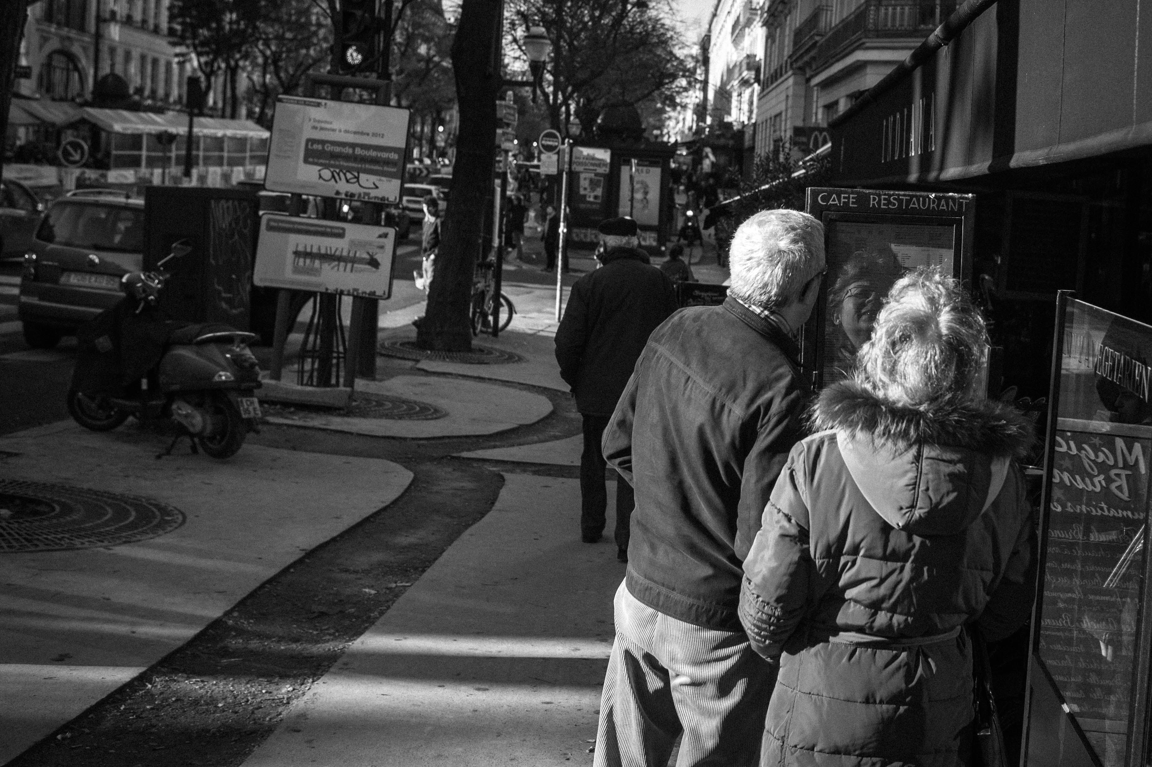 In a sun-dappled Paris street, an elderly couple engages with a café menu, embodying a moment of shared discovery. The composition features a gentle play of light and shadow, highlighting their warmth against a bustling urban backdrop. The monochrome palette enhances the nostalgic ambiance, evoking a sense of intimacy and timelessness amidst the city's vibrancy.