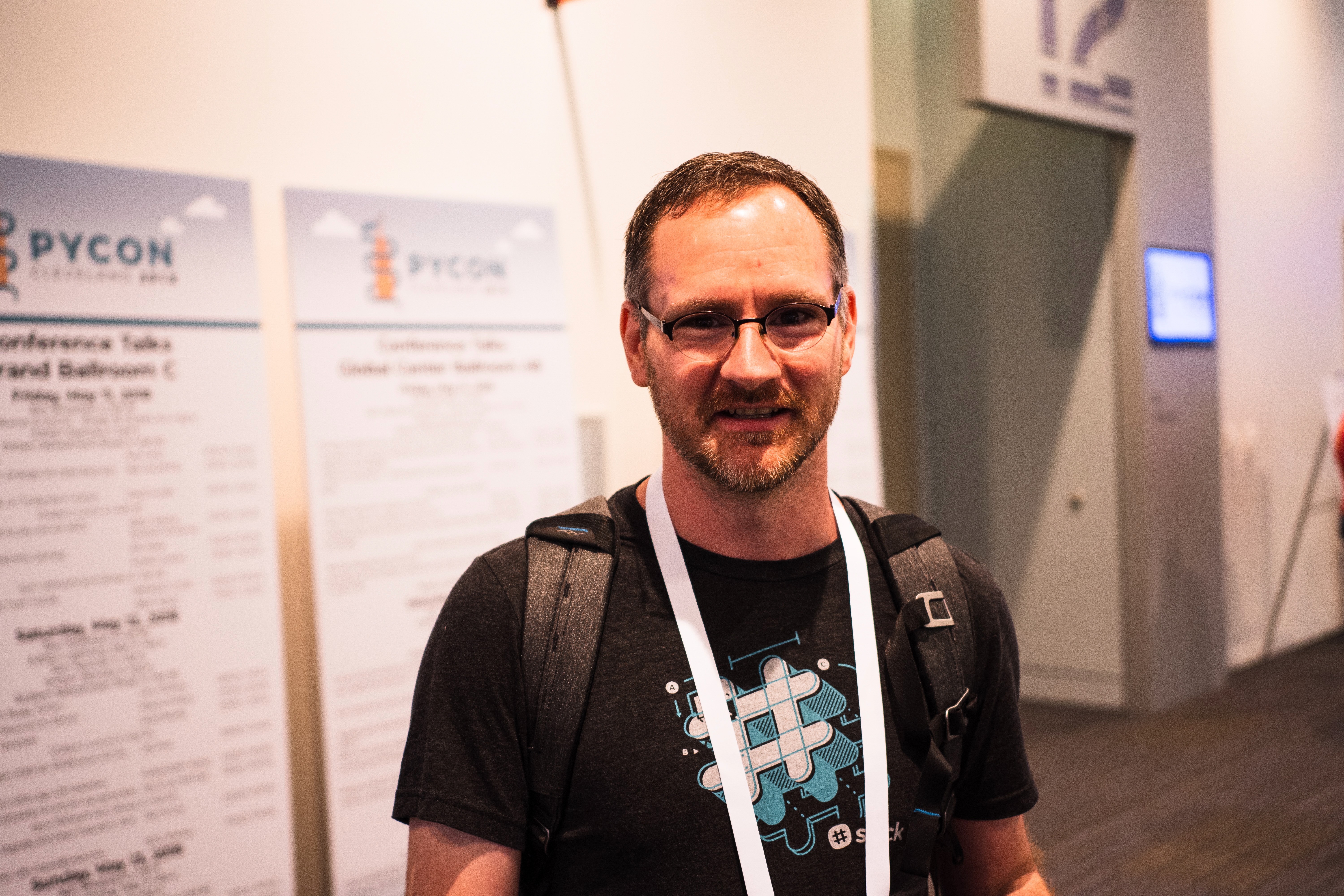 A friendly individual stands in a bustling conference setting, exuding a warm and approachable demeanor. The soft lighting highlights his features and t-shirt adorned with a tech logo, while informational signage in the background establishes the event's context. The relaxed atmosphere suggests an engaging and collaborative environment.