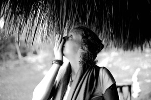 In this intimate black-and-white photograph, a woman gazes upwards, her hand lightly touching the thatched roof as if seeking a connection with the natural world around her. The soft, diffused lighting captures the serenity of the moment, while the blurred background enhances the focus on her contemplative expression. The composition invites viewers to share in her silent wonder, evoking a sense of peace and introspection.
