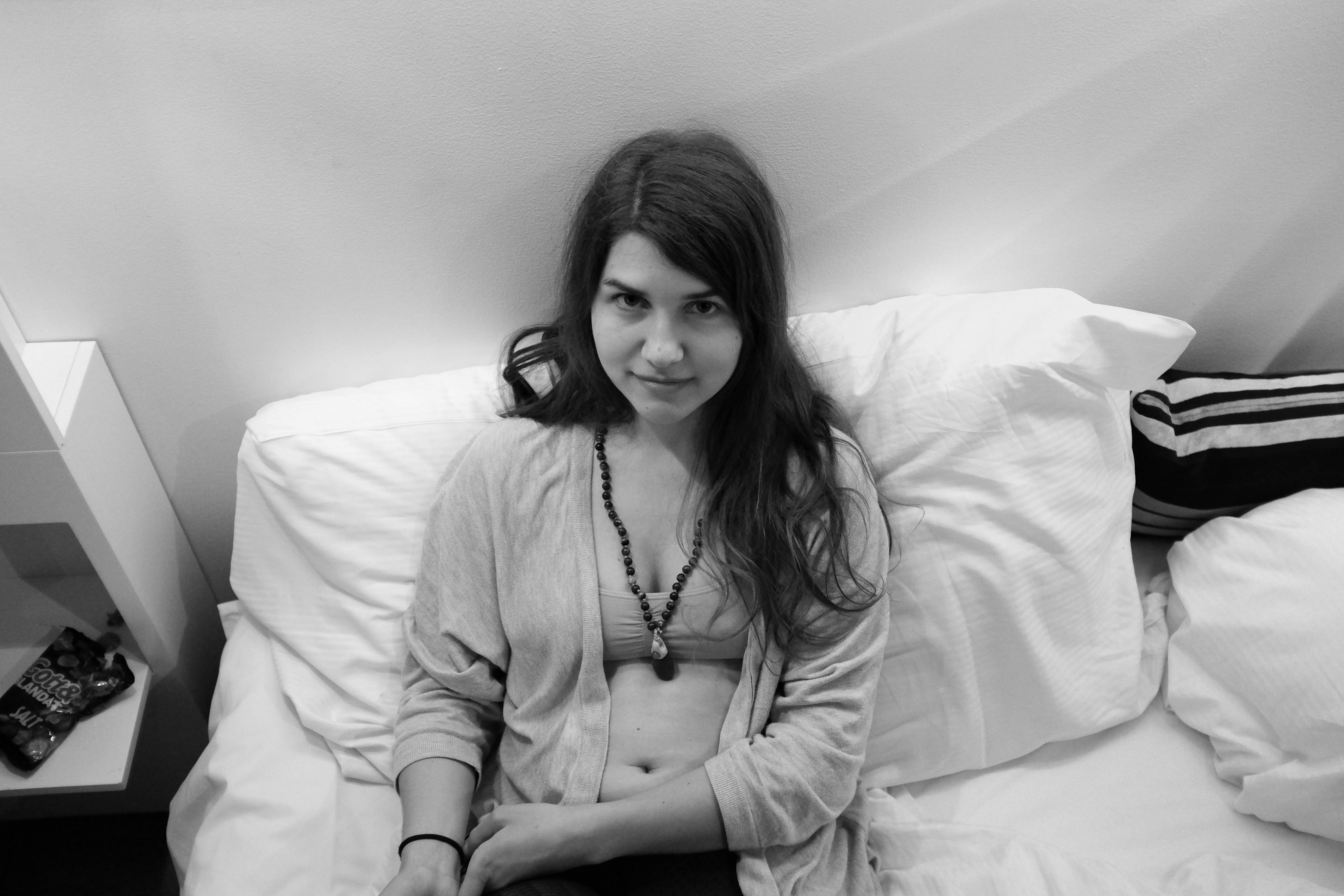 A young woman sits comfortably on a disheveled bed, exuding a calm confidence amidst a soft monochrome backdrop. The natural light gently highlights her features, creating a serene atmosphere that invites introspection and connection. Her relaxed posture and subtle smile convey a sense of vulnerability and warmth, drawing the viewer into her world.
