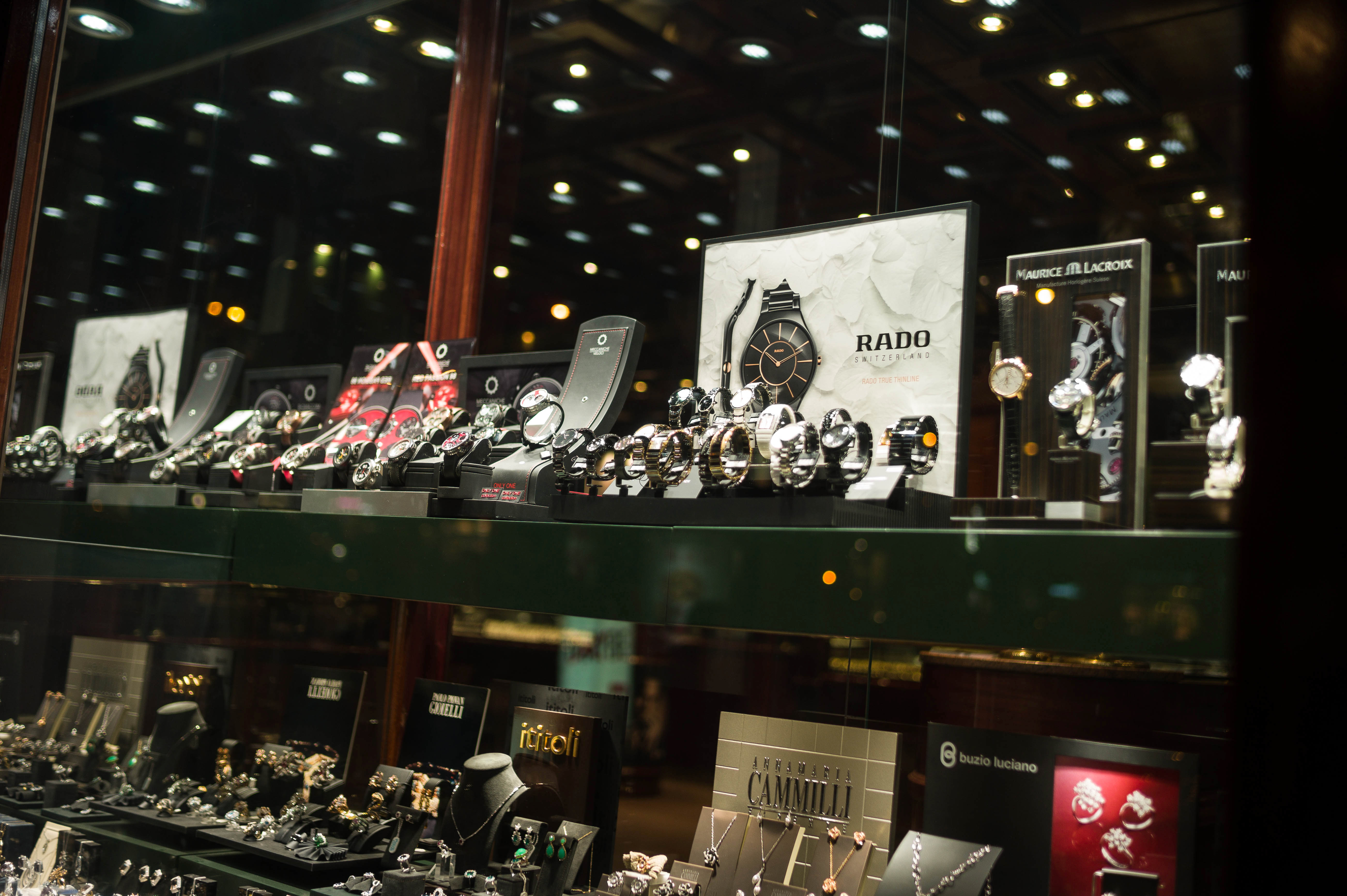 This photograph captures an exquisite window display of luxury watches, showcasing a variety of designs from renowned brands. The warm lighting highlights the intricate details of each timepiece, creating a glamorous atmosphere that invites admiration. The composition draws the eye across the neatly arranged watches, evoking a sense of opulence and sophistication.