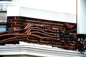 This photograph captures a complex weave of cables and wires against a backdrop of aged brick and modern architecture. The warm tones of the brick contrast sharply with the sleek black and copper of the cables, creating a visual tension. The soft lighting enhances the textural details, reflecting an intriguing intersection of the industrial and the urban landscape.