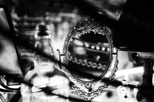In this black-and-white photograph, an ornate mirror stands amidst a collection of objects, creating a sense of nostalgia and mystery. The intricate details of the mirror's frame contrast beautifully with the blurred silhouettes of bottles and lamps in the background, casting shadows that add depth to the composition. Soft, diffused lighting enhances the intimate mood, inviting viewers to ponder the stories reflected in the glass.