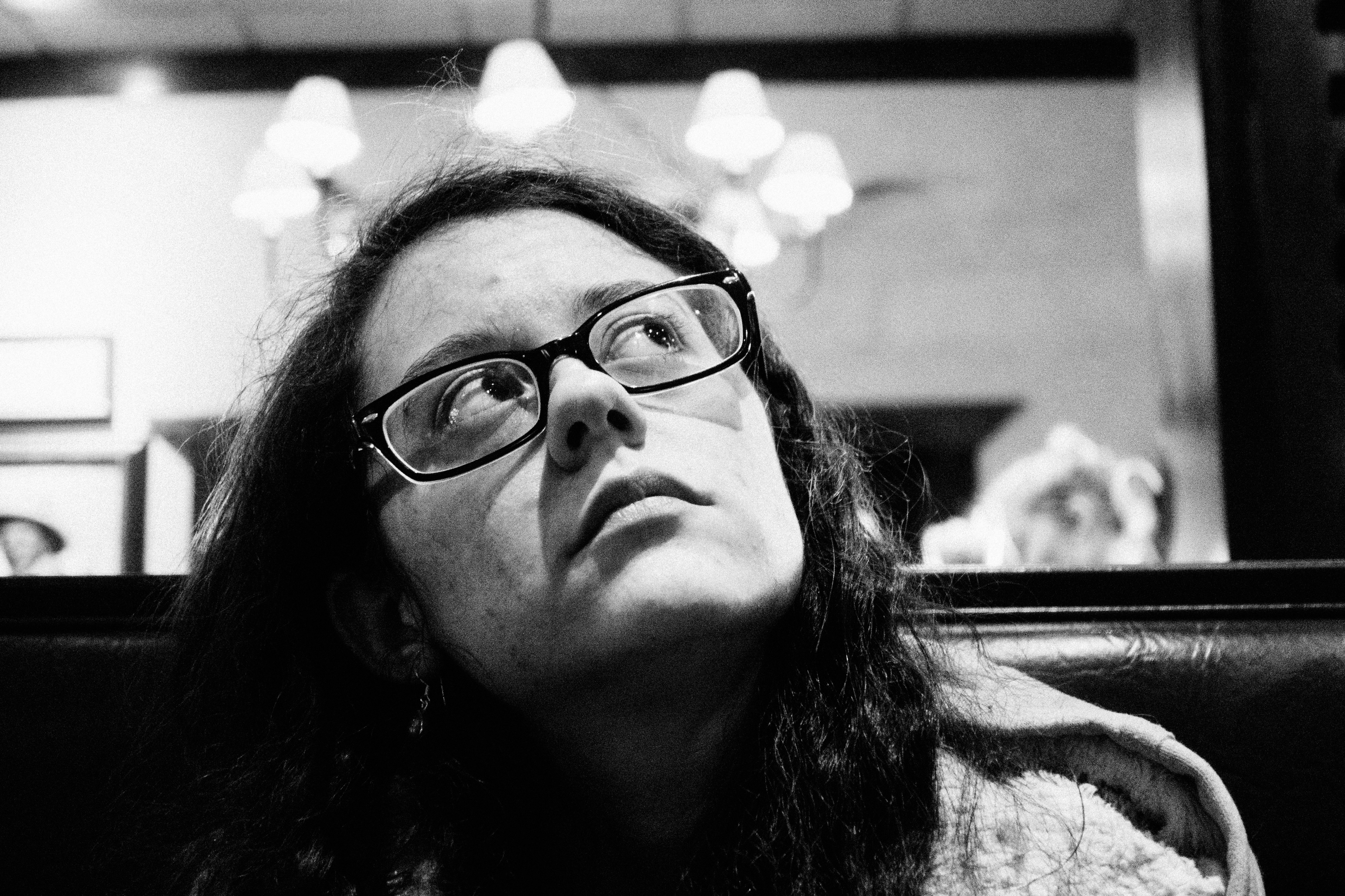 In this striking black and white photograph, a woman gazes thoughtfully upward, her expression a blend of curiosity and introspection. The soft, diffuse lighting from overhead lamps lends a warm contrast to the cool tones of her surroundings, enhancing the sense of solitude amidst a bustling space. The composition draws the viewer's eye to her contemplative demeanor, capturing a moment of quiet reflection in a lively setting.