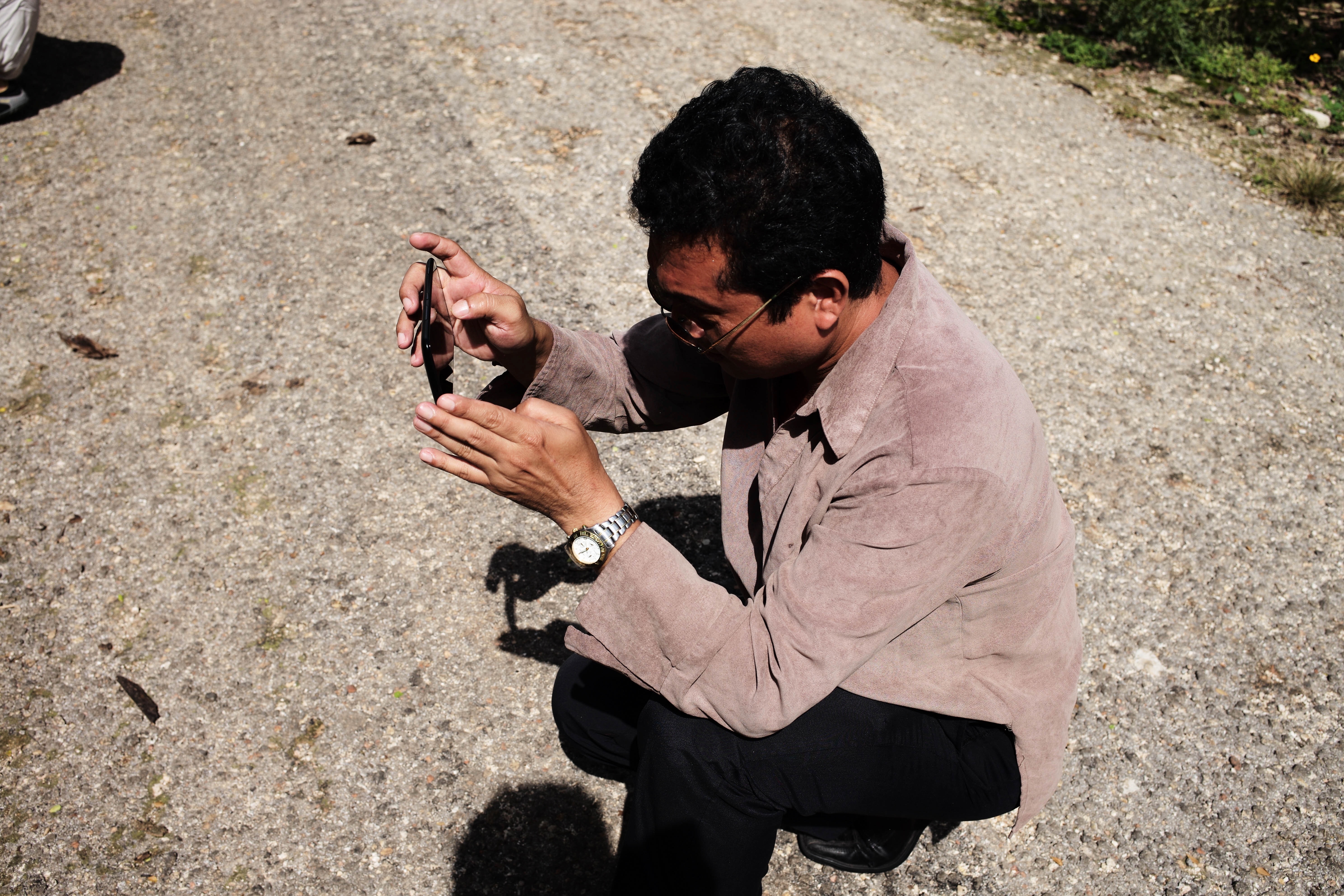 A man kneels intently on a sunlit gravel path, engrossed in capturing a snapshot with his phone. His focused expression and subtle gestures convey a sense of curiosity and engagement with his surroundings. The warm lighting enhances the relaxed yet purposeful atmosphere of the moment, inviting the viewer into his experience.