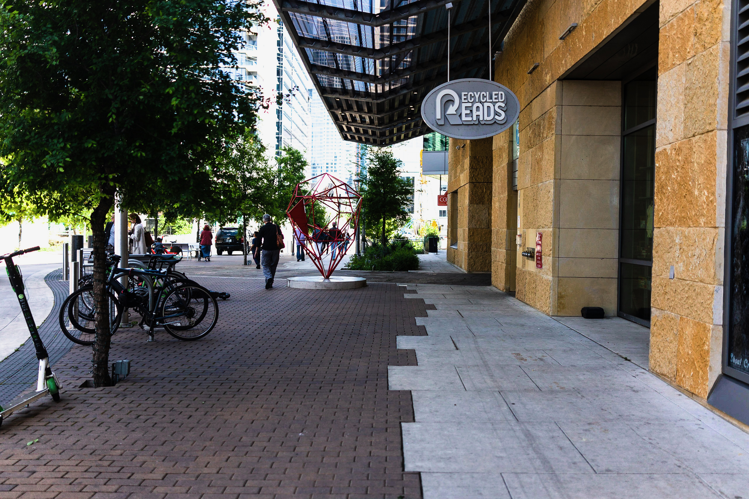 This photograph captures a lively urban scene along a pedestrian walkway, lined with greenery and modern architecture. The warm sunlight casts soft shadows on the textured pavement, creating a welcoming atmosphere as people wander past a striking geometric sculpture. Bicycles and scooters hint at a dynamic, eco-conscious community engaging with their vibrant surroundings.