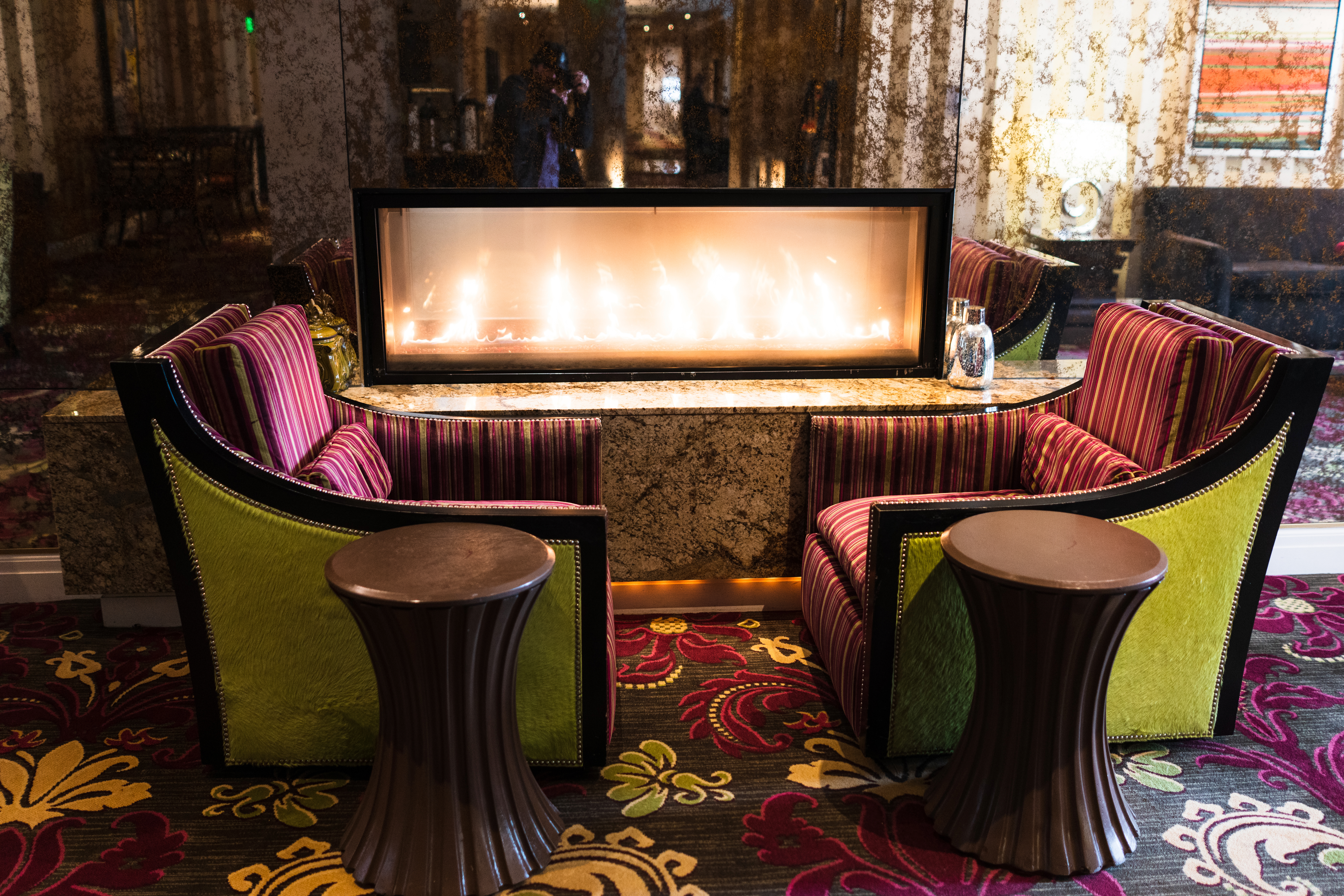 This photograph showcases a cozy seating arrangement, highlighted by a modern fireplace that serves as a centerpiece. The vibrant colors of the upholstered chairs contrast beautifully with the ornate patterned carpet, creating an inviting atmosphere. Soft lighting reflects off the glass and adds warmth to the scene, suggesting a perfect spot for relaxation and conversation.