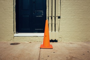 In this photograph, a vivid orange traffic cone stands prominently on a sunlit sidewalk, juxtaposed against a muted green brick wall and a dark wooden door. The simple composition draws attention to the contrast between the bright cone and its surroundings, evoking a sense of alertness amid urban tranquility. The clean lines and soft shadows enhance the mood of stillness, suggesting an interrupted flow of city life.