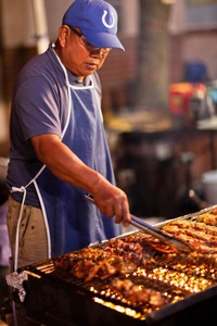 A warm glow illuminates a focused cook as he skillfully tends to sizzling meats on a grill. The steam and smoke create a lively atmosphere, hinting at the delicious aromas wafting through the air. His concentration amidst the bustling environment captures the essence of culinary passion and dedication.