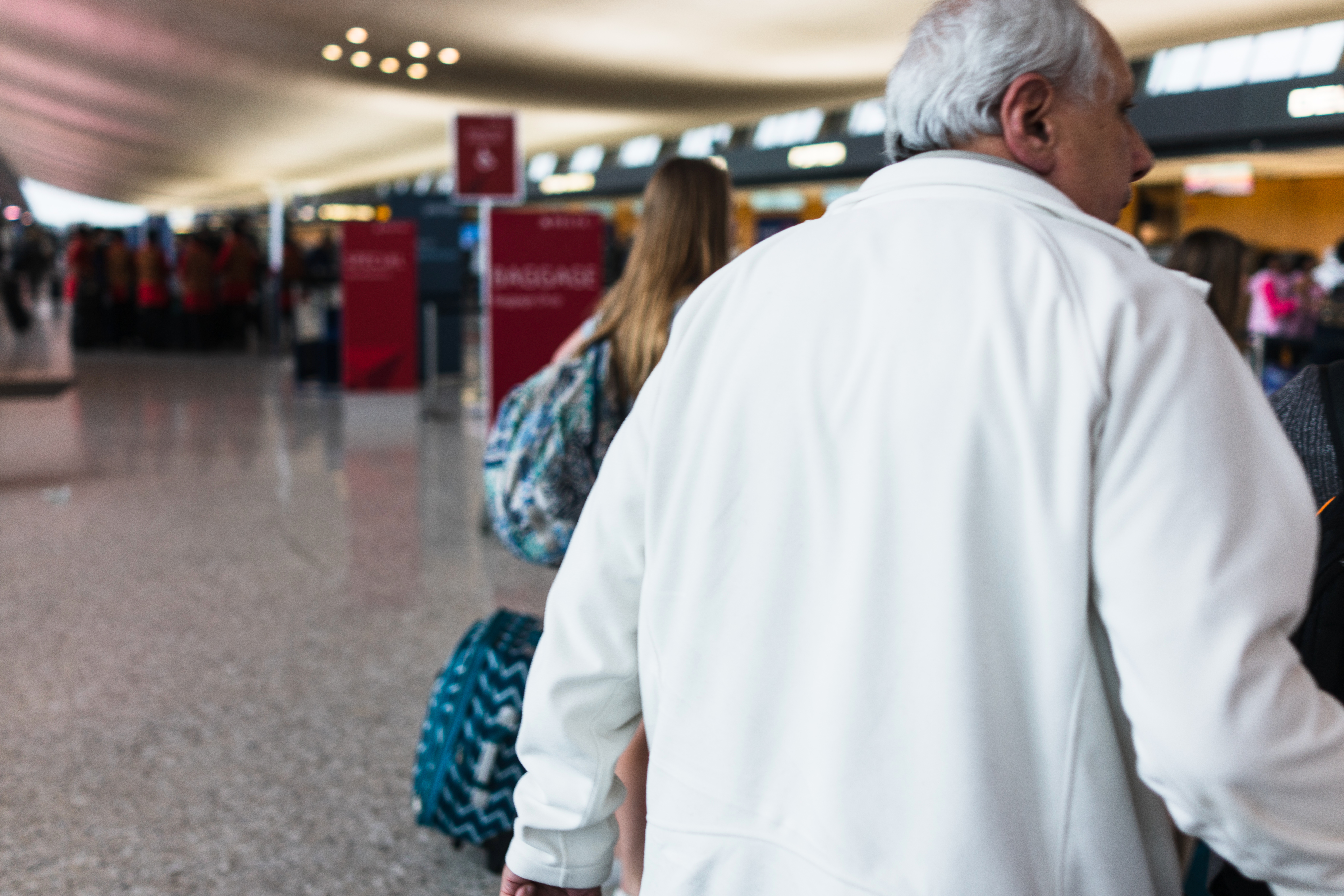 In this bustling airport scene, an elderly man in a white jacket stands with his back to the camera, hinting at a sense of anticipation. The soft, diffused lighting creates a bright yet calm atmosphere, while the blurred figures of travelers emphasize the dynamic energy of travel. The contrast of the man's solid presence against the surrounding movement evokes a feeling of contemplation amidst the chaos.
