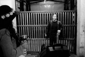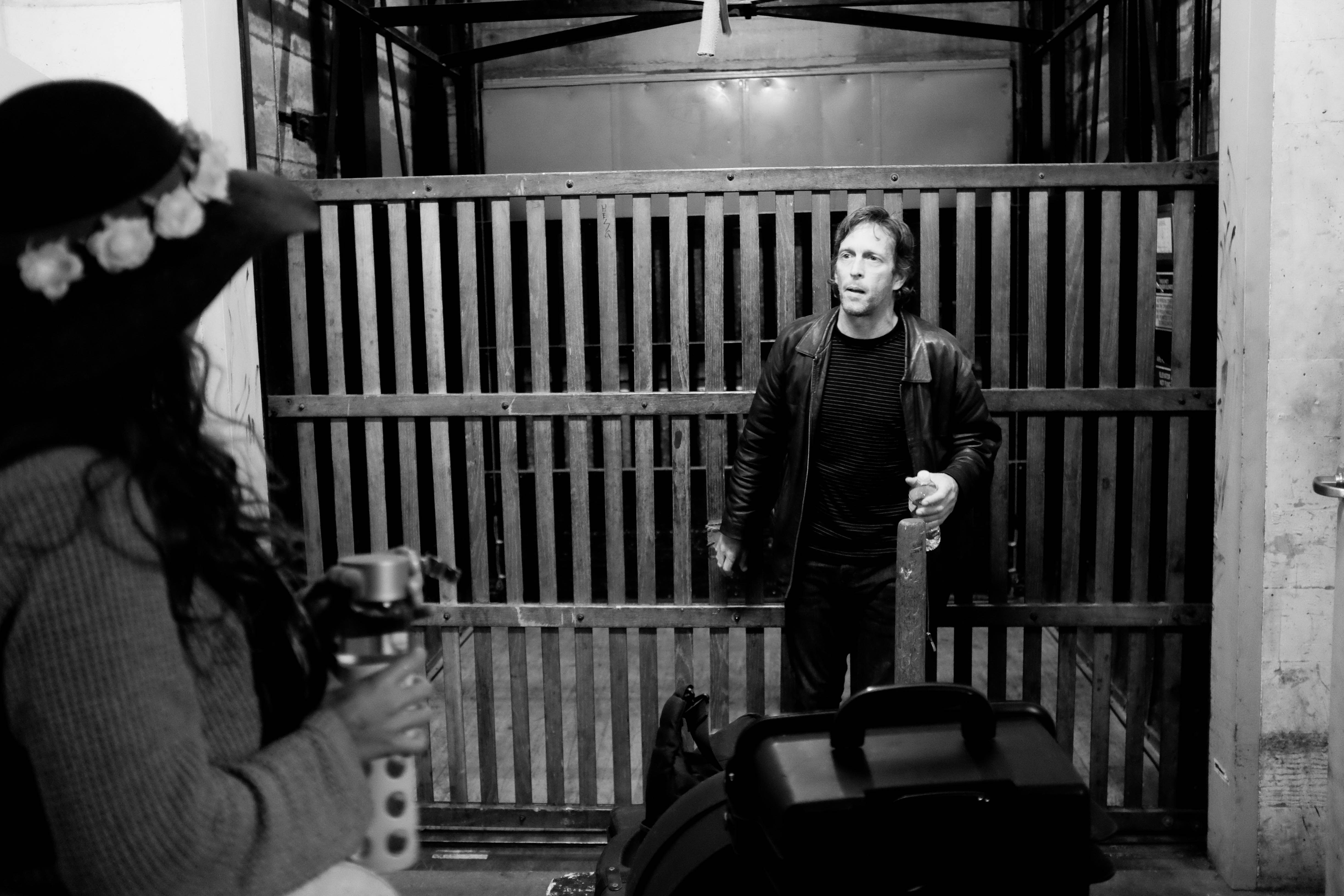 In a dimly lit elevator shaft, a man stands in a tense posture, looking bewildered as he holds a wooden object. A woman, partially obscured, watches him intently, her floral hat adding a touch of softness to the gritty surroundings. The stark contrast of light and shadow creates a moody atmosphere, amplifying the suspense in this evocative moment.