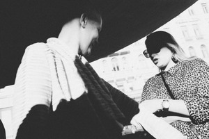 This striking black-and-white photograph captures a candid moment between two figures, highlighting their interaction beneath a shadowy structure. The contrasting light creates a dramatic mood, enhancing the textures of their clothing and expressions. The composition draws the viewer's eye toward the subtle dynamics of their conversation, inviting curiosity about their story.