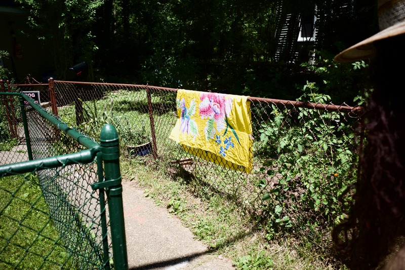 A vibrant yellow towel hangs lazily over a rusted fence, its bright colors contrasting with the lush greenery surrounding it. Sunlight filters through the trees, casting dappled shadows on the pathway, evoking a sense of warmth and nostalgia. The composition captures a serene moment, hinting at leisure and the joys of summer.
