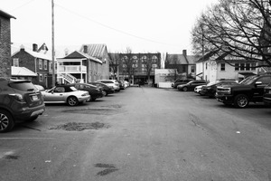This black and white photograph captures a quiet parking lot flanked by two rows of parked cars on either side. The overcast sky casts a soft, diffused light, enhancing the subdued mood and emphasizing the stark lines of the asphalt and the buildings in the background. The composition leads the eye down the center of the lot, creating a sense of depth and perspective amid the stillness.