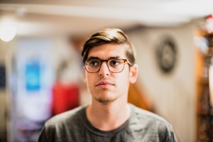 The photograph captures a young man lost in thought, framed amidst a softly blurred background. The warm, diffused lighting creates an intimate and introspective atmosphere, highlighting his pensive expression and stylish glasses. His simple attire contrasts with the colorful hints in the background, drawing the viewer's focus to his contemplative demeanor.