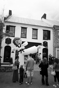 In a bustling street scene, an oversized inflatable martial artist dominates the foreground, striking a dynamic pose that evokes a sense of playful energy. Surrounding onlookers, a mix of adults and children, exhibit curiosity and amusement, all framed against a backdrop of quaint, monochrome architecture. The soft, muted lighting adds a whimsical yet nostalgic atmosphere to this lively moment.