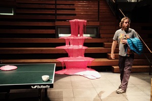 In a strikingly artistic setting, a man walks past a bizarre pink goo fountain, exuding a whimsical yet contemplative mood. The contrast between the casual ping pong table and the vibrant, melting sculpture draws the eye, creating a surreal atmosphere. Soft, ambient lighting highlights the textural details of both the man and the playful installation, enhancing the scene's eccentricity.