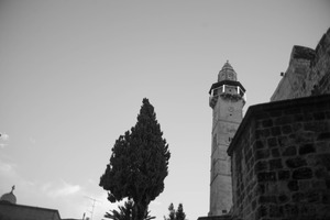 In a stark monochrome palette, the photograph captures an ancient minaret rising against the sky, its watchful presence framed by an imposing stone wall and an elegantly swaying cypress tree. The composition evokes a mood of solitude and introspection, with the soft light casting gentle shadows that emphasize the architectural grandeur. This juxtaposition of natural and constructed forms invites the viewer to reflect on the passage of time in a quiet, reverent setting.