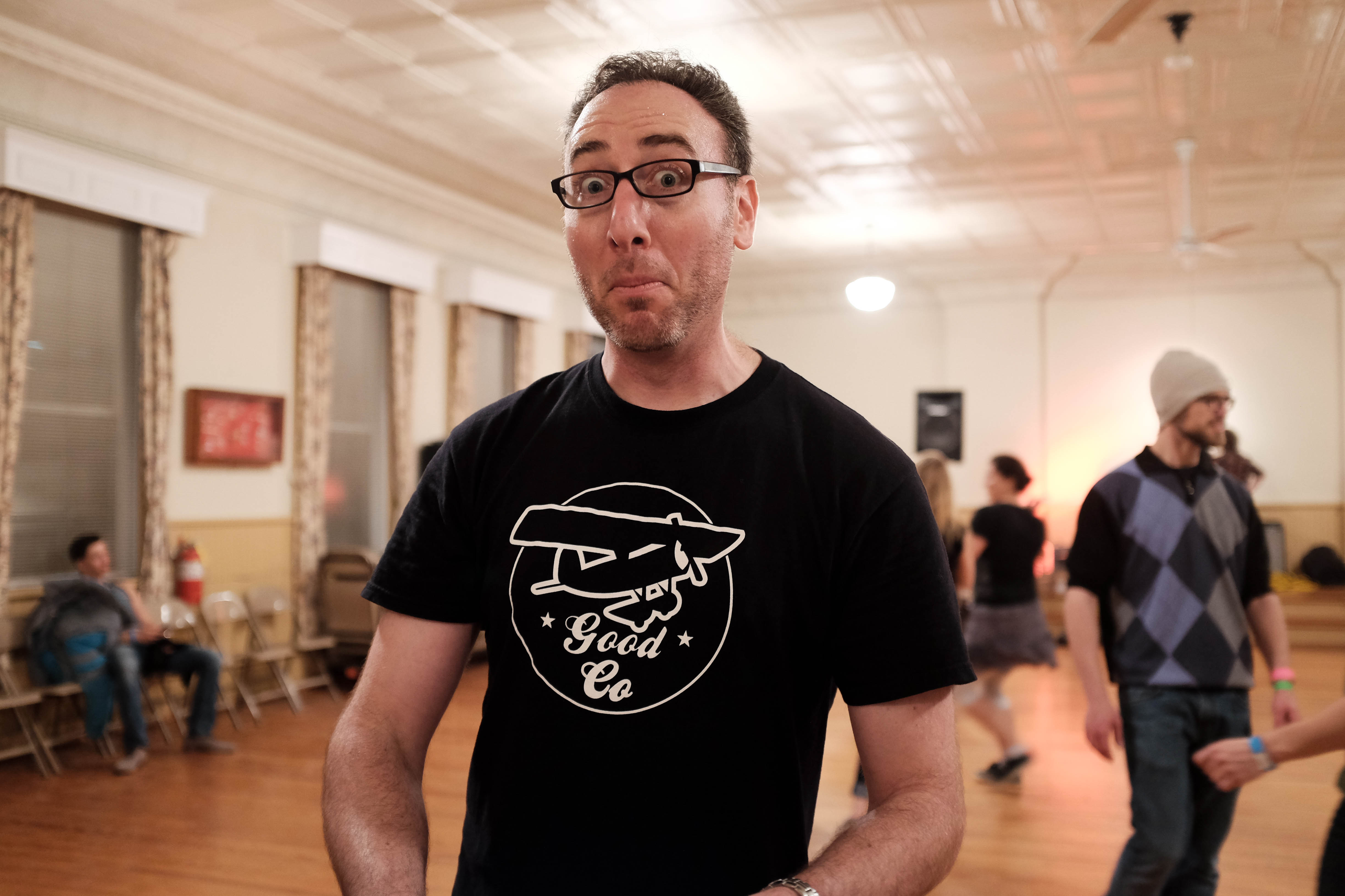 The photograph captures a lively moment during a dance event, focusing on a man with a surprised expression, adding a touch of humor to the scene. The ambient lighting gives a warm and inviting feel, while the blurred figures in the background suggest motion and energy, reinforcing the joyful atmosphere of the gathering.