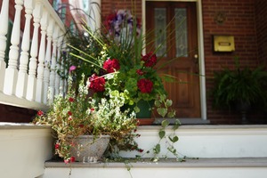 A charming entryway adorned with vibrant flowers creates an inviting atmosphere. The warm sunlight highlights the rich colors of the blooms against the soft white of the railing and the solid wooden door, evoking a sense of warmth and home. Lush greenery and carefully arranged pots enhance the tranquil mood, suggesting a harmonious connection to nature.