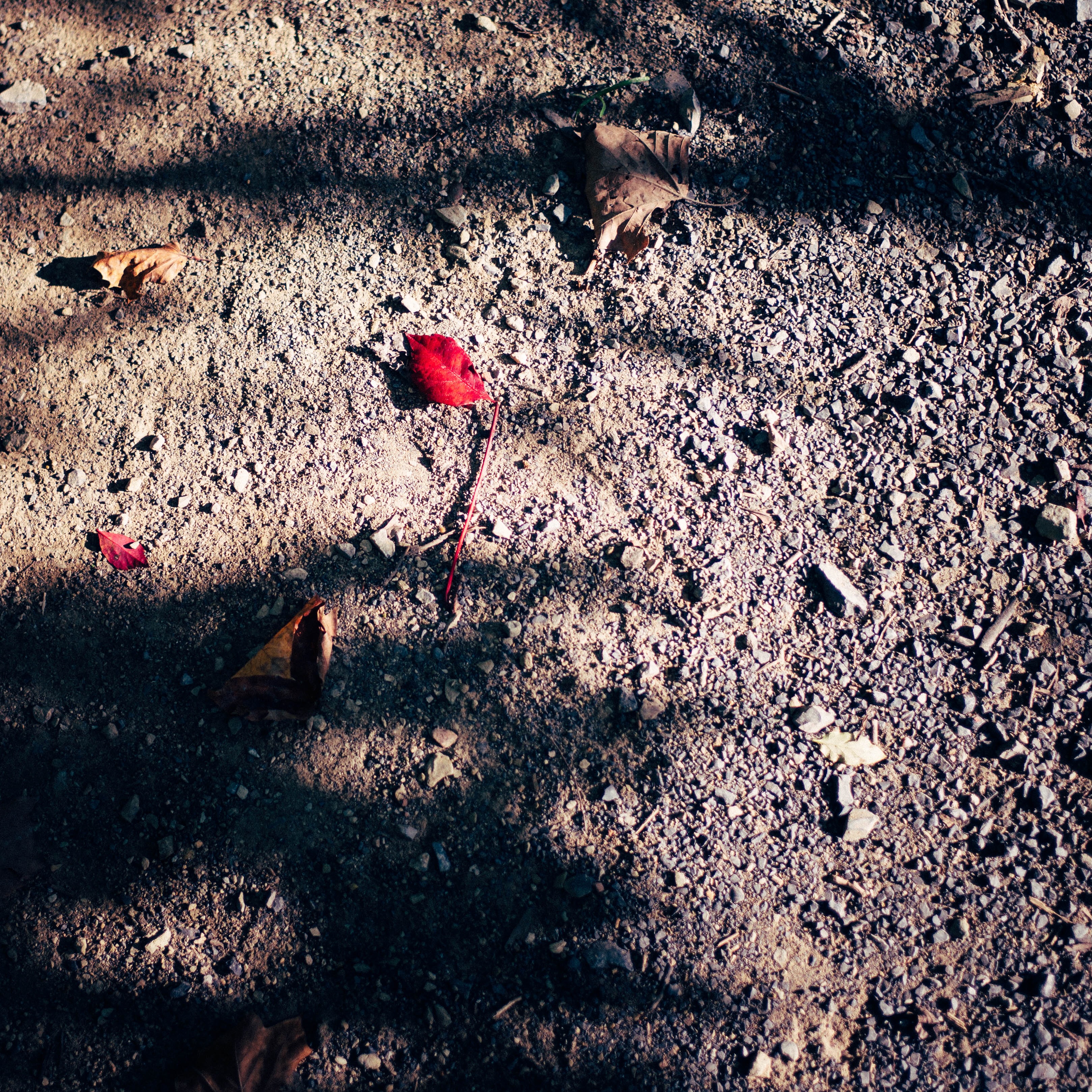 On a textured ground scattered with fallen leaves, a solitary vibrant red leaf draws the eye amid muted hues of browns and grays. The interplay of light and shadow creates a contemplative mood, emphasizing the transient beauty of autumn. This composition highlights the delicate balance between vibrancy and decay, inviting reflection on the passage of time.