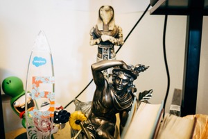 This photograph captures an eclectic arrangement of objects, with a striking bronze figure at the forefront, exuding a sense of classical elegance. The mood is playful and nostalgic, illuminated by warm lighting that highlights the textures and details of each piece. Behind the figure, a unique mix of modern and ancient artifacts adds depth, creating a layered composition that invites closer inspection.