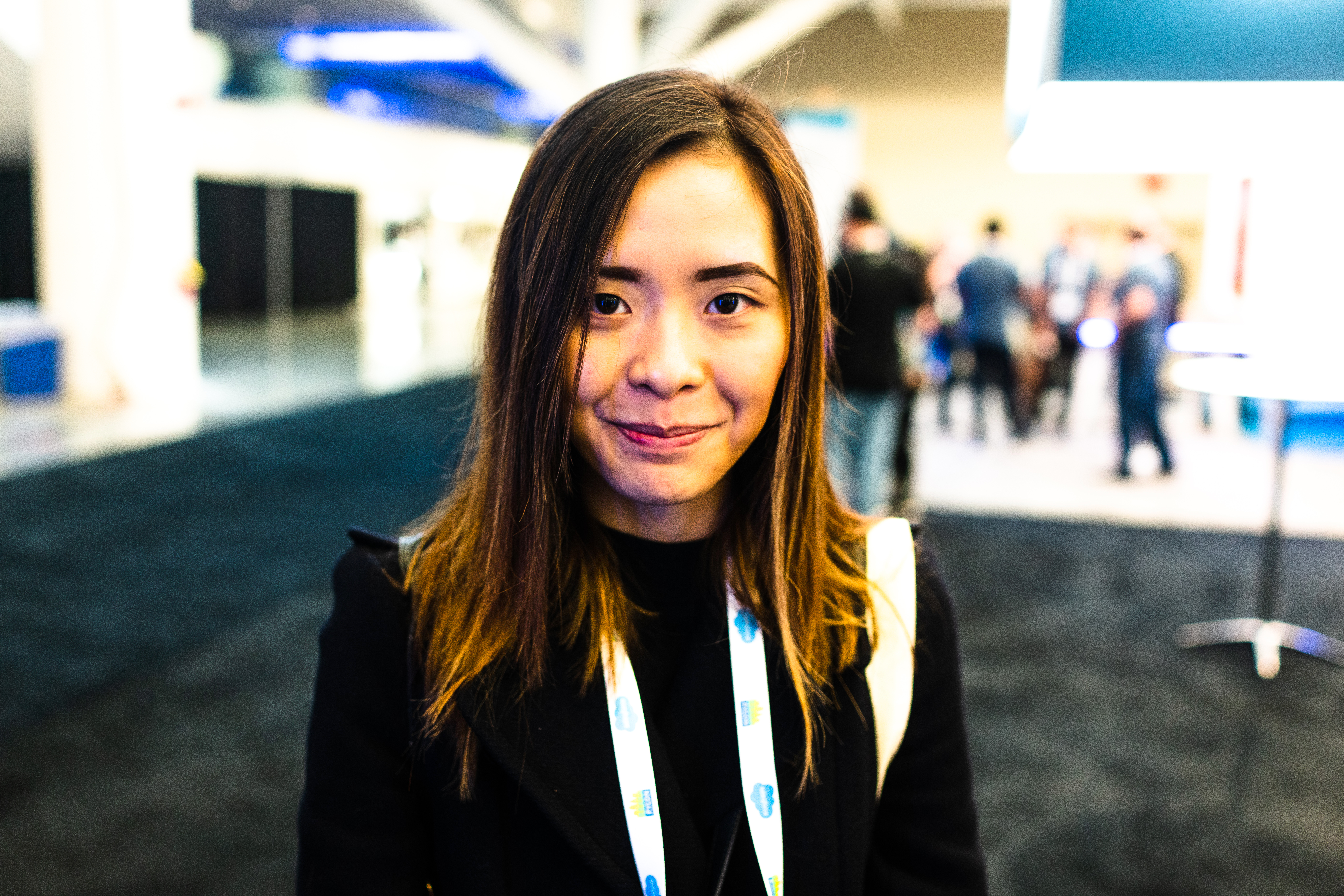The photograph features a young woman standing in a bustling event space, her demeanor exuding warmth and approachability. The surrounding blur of activity contrasts with her focused expression, enhanced by vibrant lighting that highlights her features. The black carpet beneath her and the soft background create a sense of depth, drawing the viewer's attention to her presence amidst the crowd.