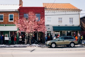 A vibrant scene unfolds on a bustling street, where an array of colorful storefronts houses a line of eager patrons. The pink blooms of a flowering tree add a touch of warmth and joy, contrasting beautifully with the remnants of winter's snow. The bright daylight enhances the lively atmosphere, capturing a moment of community engagement and seasonal renewal.