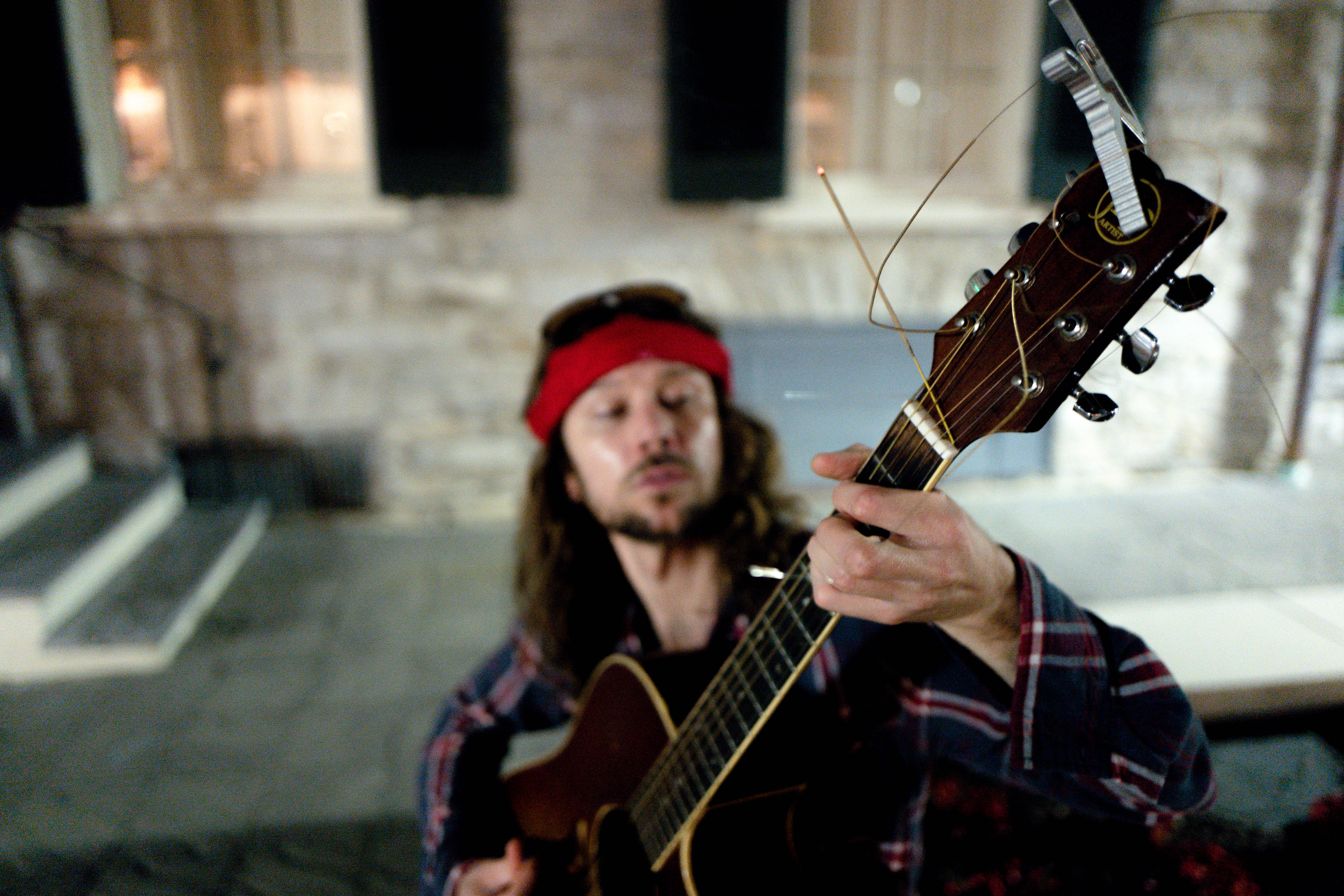 In a dimly lit setting, a musician is captured mid-performance as he strums his guitar, his intense concentration evident. The warm tones from the surroundings create an intimate atmosphere, while his casual attire and energetic demeanor evoke a sense of spontaneity and passion. The soft focus of the background draws attention to his expressive face, enhancing the mood of creativity and connection with the music.