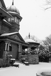This photograph captures a stately old house blanketed in fresh snow, exuding a sense of quiet nostalgia and solitude. The stark black and white tones enhance the wintry mood, while the intricate architectural details of the house and gazebo draw the eye, evoking a timeless charm. Softly falling snowflakes create a dreamy atmosphere, blurring the boundaries between the home and its tranquil surroundings.