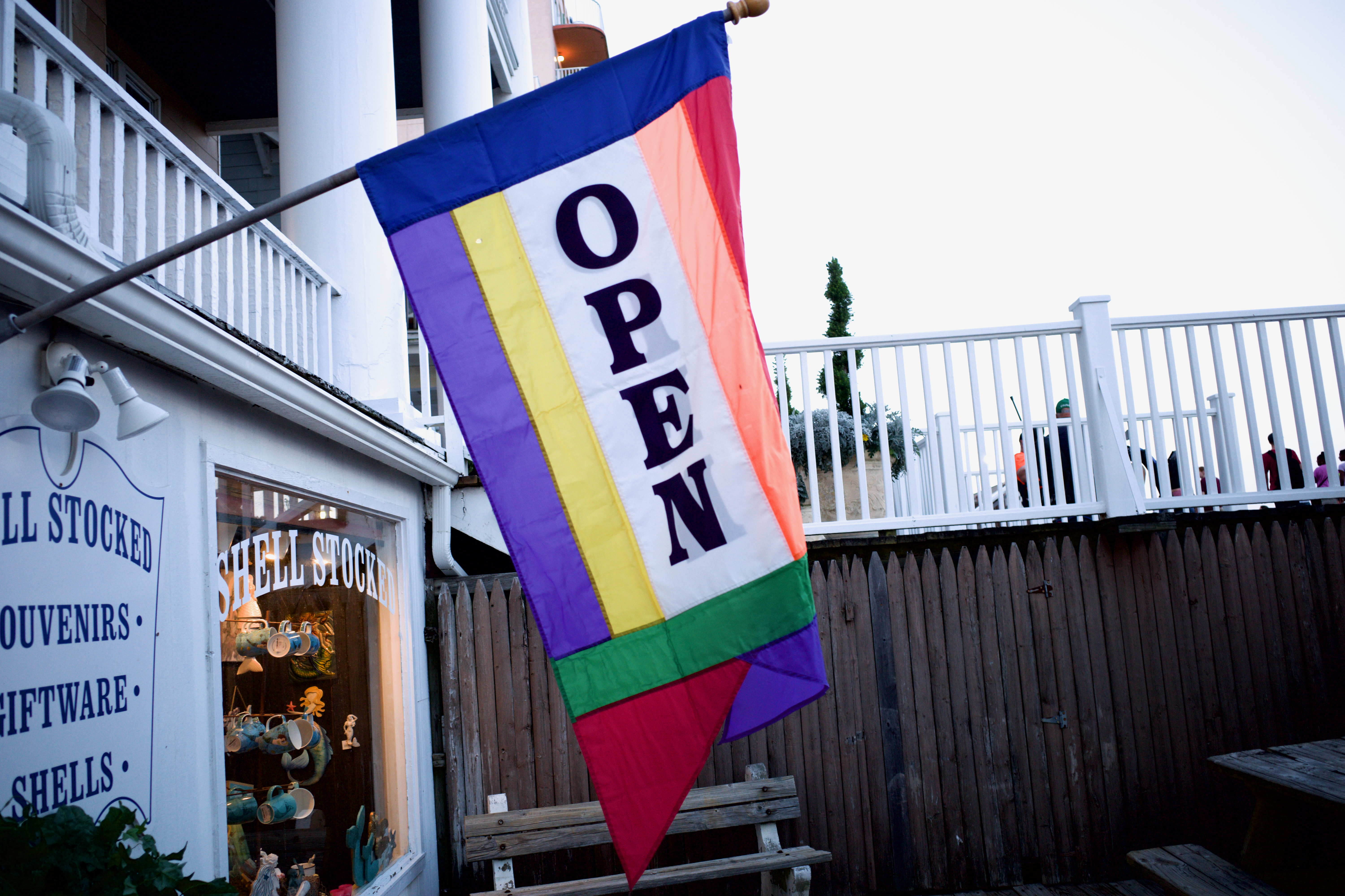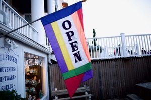 A vibrant flag reading 'OPEN' flutters gently against a soft twilight backdrop. The colorful stripes of the banner contrast beautifully with the warm glow from the shop's window, inviting passersby to explore. The mood is friendly and welcoming, capturing the essence of a lively coastal atmosphere.