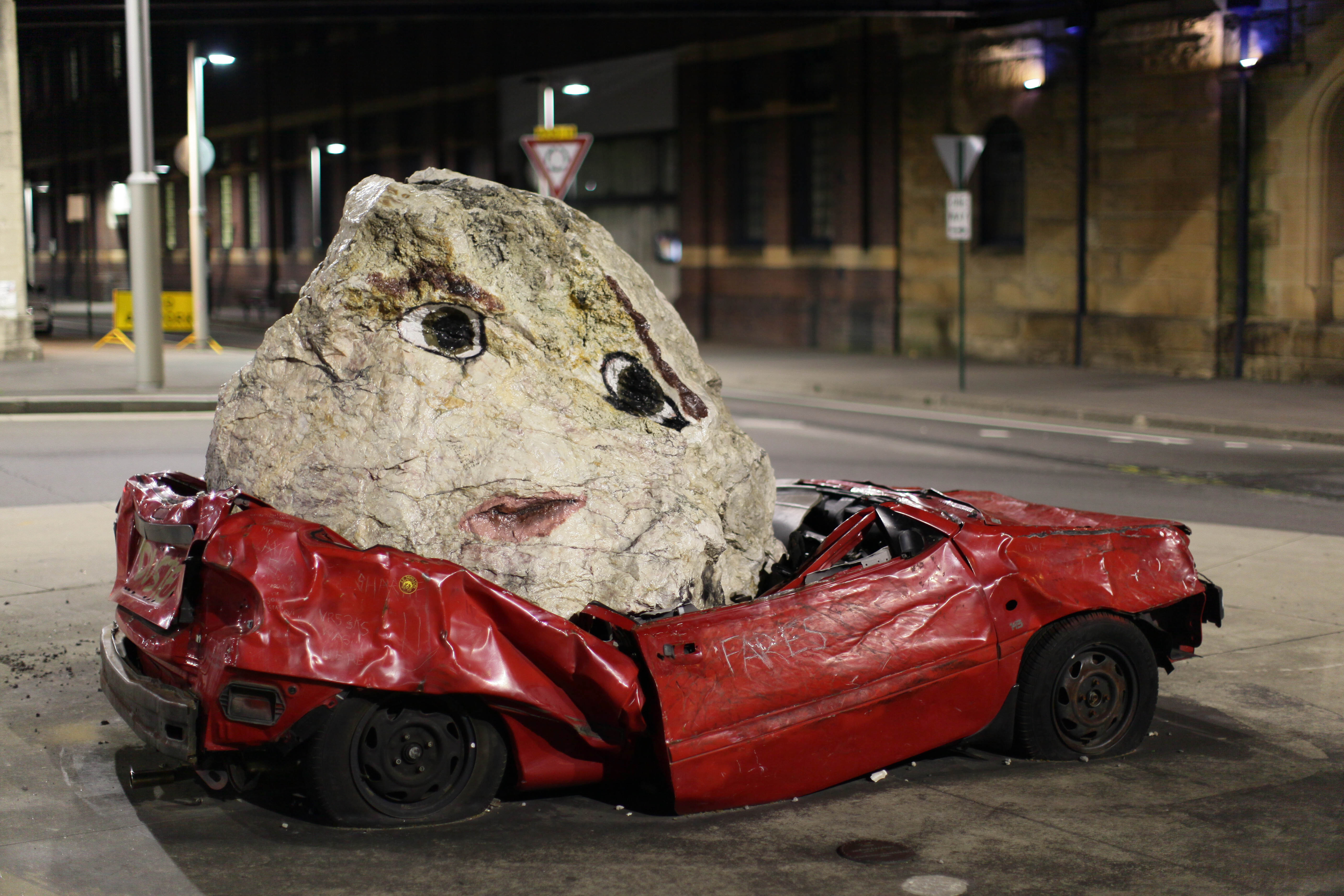 In a dimly lit urban setting, a battered red car is comically topped with a large, cartoonish rock featuring human-like eyes and a faint smile. The contrast between the vibrant car and the heavy stone creates a surreal juxtaposition, evoking a sense of whimsy and absurdity. Shadows play across the scene, enhancing the mood of surrealism amid an otherwise mundane nighttime backdrop.