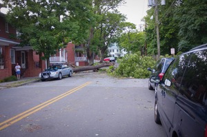 A fallen tree sprawls across the street, obstructing traffic and creating a stark interruption in the tranquil suburban scene. The mood is one of surprise and concern, highlighted by the distant onlookers and the presence of a police car, suggesting a community dealing with an unforeseen challenge. Soft, diffused lighting enhances the calmness of the surroundings, contrasting with the chaotic disruption at the center of the composition.