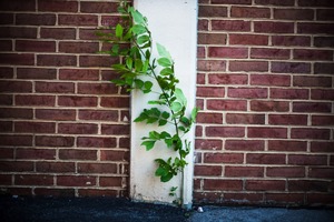 A vibrant green vine climbs the stark section of a white wall nestled against a rugged red brick backdrop. The contrast between the lush foliage and the hard surfaces creates a mood of persistence and life amid industrial decay, illuminated by soft natural light that highlights the texture of both the leaves and the bricks.