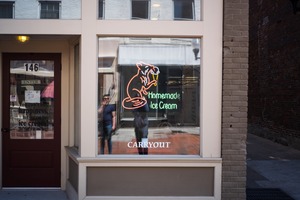 The photograph captures a charming ice cream shop window adorned with a playful neon sign of a rodent enjoying a treat, evoking a sense of nostalgia and joy. Soft, natural light bathes the scene, highlighting the reflections of passersby who seem to be drawn in by the inviting atmosphere. The composition balances whimsy with a hint of urban life, creating a cozy yet lively mood.