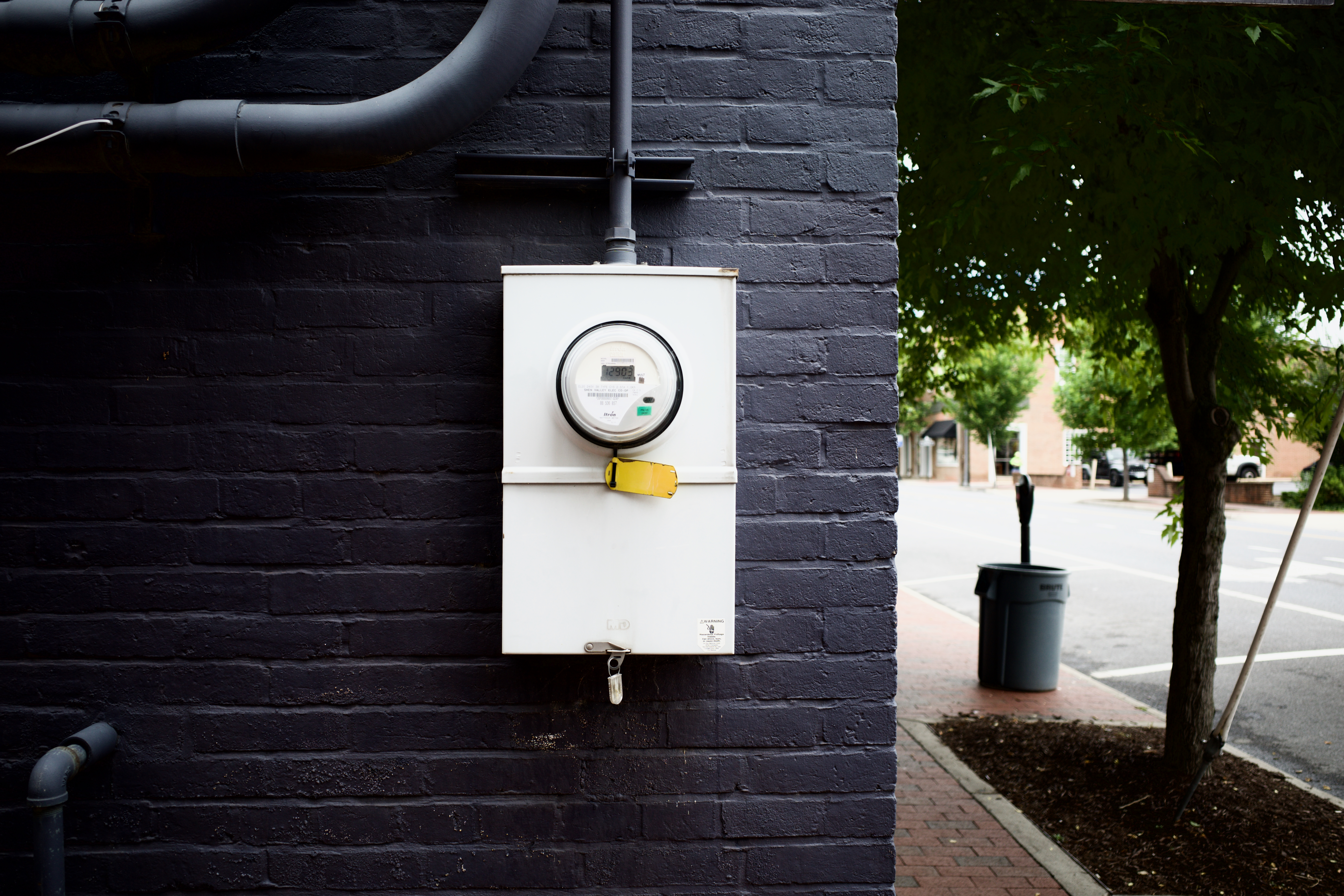The photograph captures a white electricity meter mounted on a textured black brick wall, contrasting sharply against its backdrop. The composition evokes a sense of solitude, framed by overhanging tree branches and a quiet street scene beyond, where muted colors and soft lighting create a calm, introspective mood. The interplay between the man-made utility and the organic greenery suggests a delicate balance between urban life and nature.
