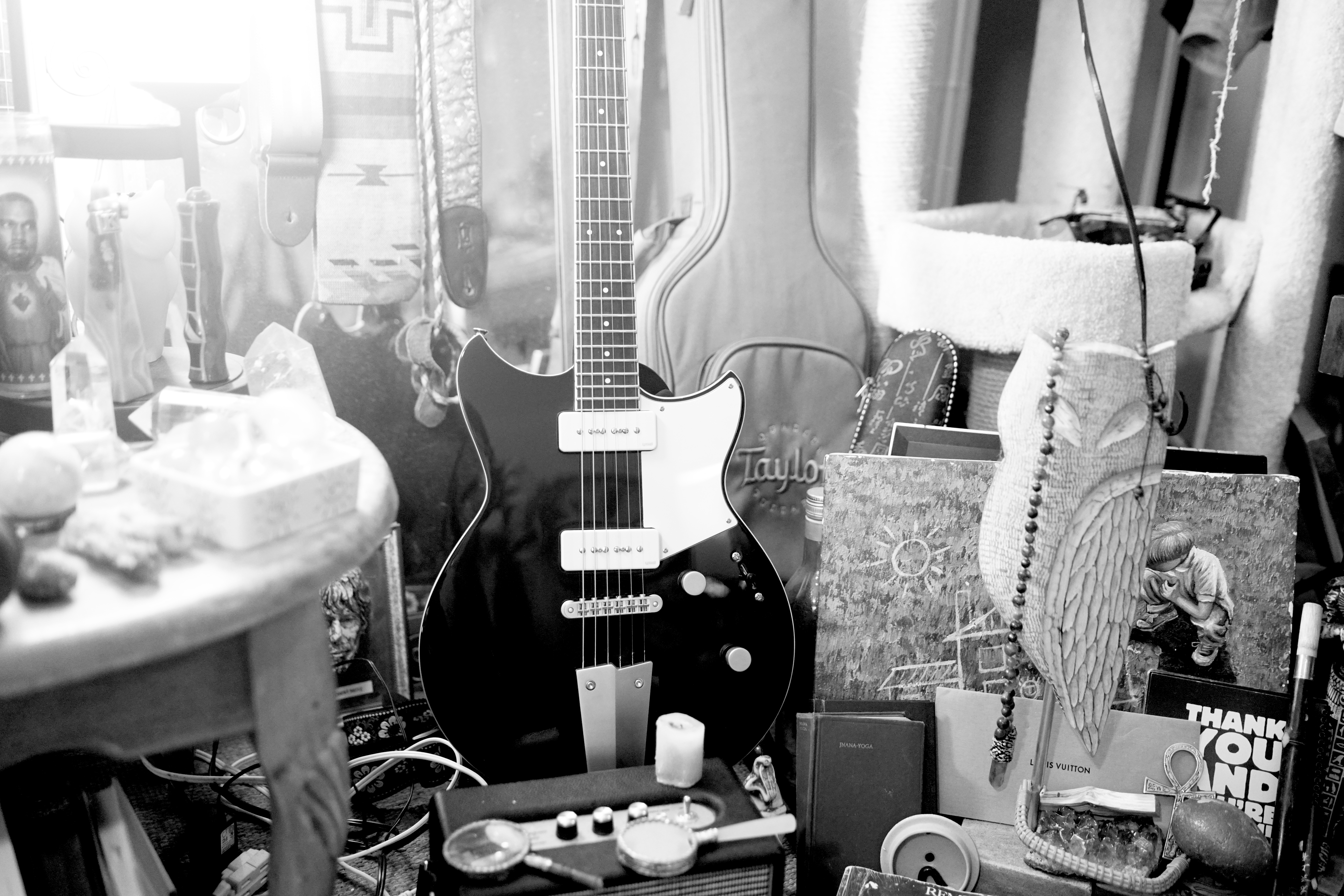 In this black-and-white photograph, a vintage guitar stands amid a clutter of personal treasures, including art, stones, and candles. The soft lighting creates a nostalgic atmosphere, casting gentle shadows that enhance the sense of intimacy and warmth within this eclectic space. The composition captures both the subject's significance and the cherished memories of a creative soul.