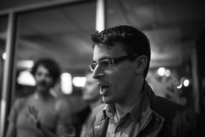 The photograph captures a lively moment of conversation, with the focal figure animatedly speaking, his expression full of passion. The dim lighting and soft focus create an intimate atmosphere, while the blurred background figures suggest a convivial setting. The monochrome palette enhances the emotional intensity, encouraging the viewer to delve into the candid moment between friends.