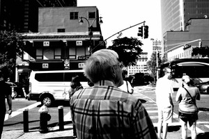 In this black and white photograph, an elderly man stands contemplatively at a bustling street corner, his back turned toward the viewer. The contrast between his plaid shirt and the stark urban environment captures a sense of nostalgia amid the modern chaos. Bright sunlight casts defined shadows, enhancing the bustling mood of the city as people rush past him, oblivious to the stillness he embodies.
