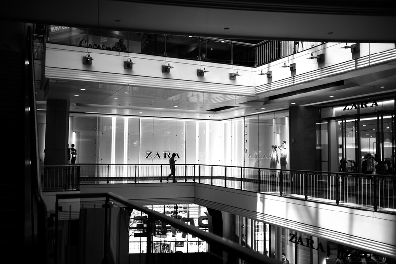 This black-and-white photograph captures the contemporary architecture of a shopping mall, highlighting the interplay of light and shadows. A solitary figure walks along the upper level, creating a sense of intimacy within the expansive space while contrasting starkly against the luminous Zara storefront. The composition draws the eye upwards, emphasizing the clean lines and modern aesthetic of the environment.
