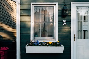 The photograph captures a quaint window adorned with vibrant flowers, reflecting a cozy, inviting atmosphere. Warm light casts soft shadows, creating a tranquil mood that feels like a gentle hug from the home. The faded green wood adds a rustic charm, inviting one to linger and imagine the stories held within.